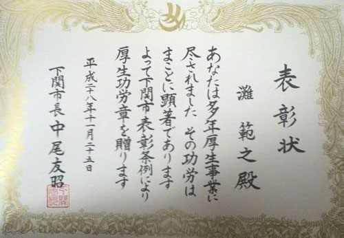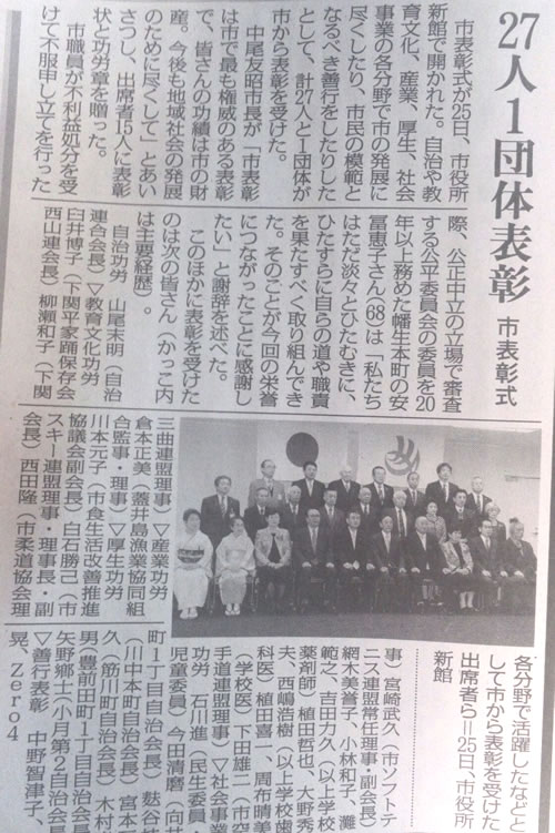 善行をしたりとした人(団体)が下関市から表彰を受けました。
