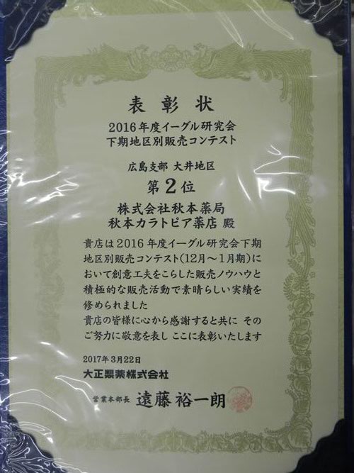 カラトピア薬店が下期地区別販売コンテストにて2位になりました。